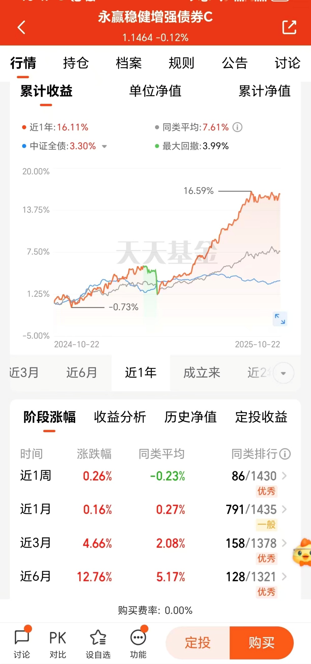 这只绩优"固收+"产品采用"债券打底+权益增强"的经典策略,底层以高等级信用债构建稳健基础,搭配利率债优化久期管理,同时通过精选低估值高股息标的与可转债增强收益弹性。截至最新数据,该产品近1月上涨1.6%,近三月涨幅达4.66%,近6月收益攀升至12.76%,近1年回报16.11%,成立以来累计收益达14.64%,在同类产品中表现突出。