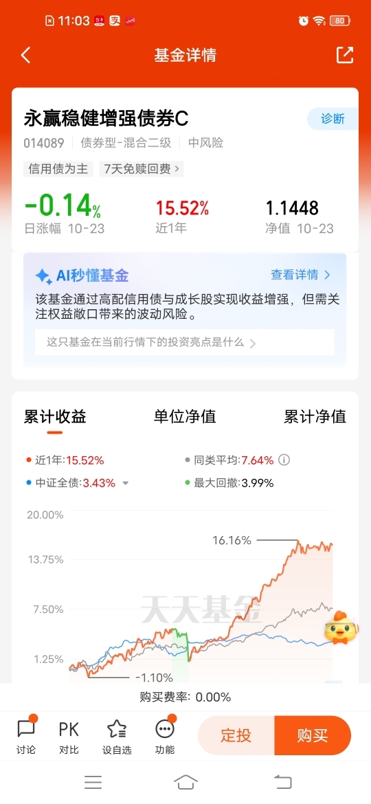 $永赢稳健增强债券C$ 固收加,稳健布局也不错,近一个月收12个蛋,近三个月收468个蛋,近半年收1224个蛋,近一年收1552个蛋,收大蛋能力强,中长期更有优势,只配置权益风险大,当下均衡配置更适宜。较高仓位债券打底,再配置一定股票来增强收益,进退皆宜,也比较适合震荡市场。#CPO、PCB大反攻!行情空间有多大?#