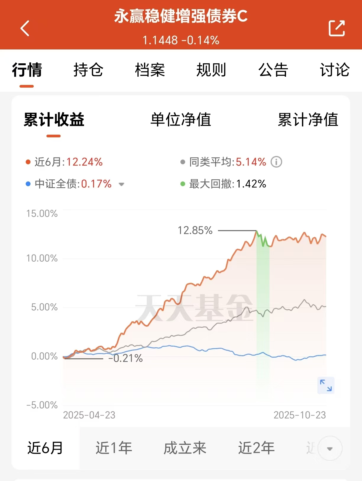 这只绩优"固收+"产品采用"债券打底+权益增强"的经典策略,底层以高等级信用债构建稳健基础,搭配利率债优化久期管理,同时通过精选低估值高股息标的与可转债增强收益弹性。截至最新数据,该产品近三月涨幅达4.68%,近6月收益攀升至12.24%,近1年回报15.52%,成立以来累计收益达14.48%,在同类产品中表现突出。
