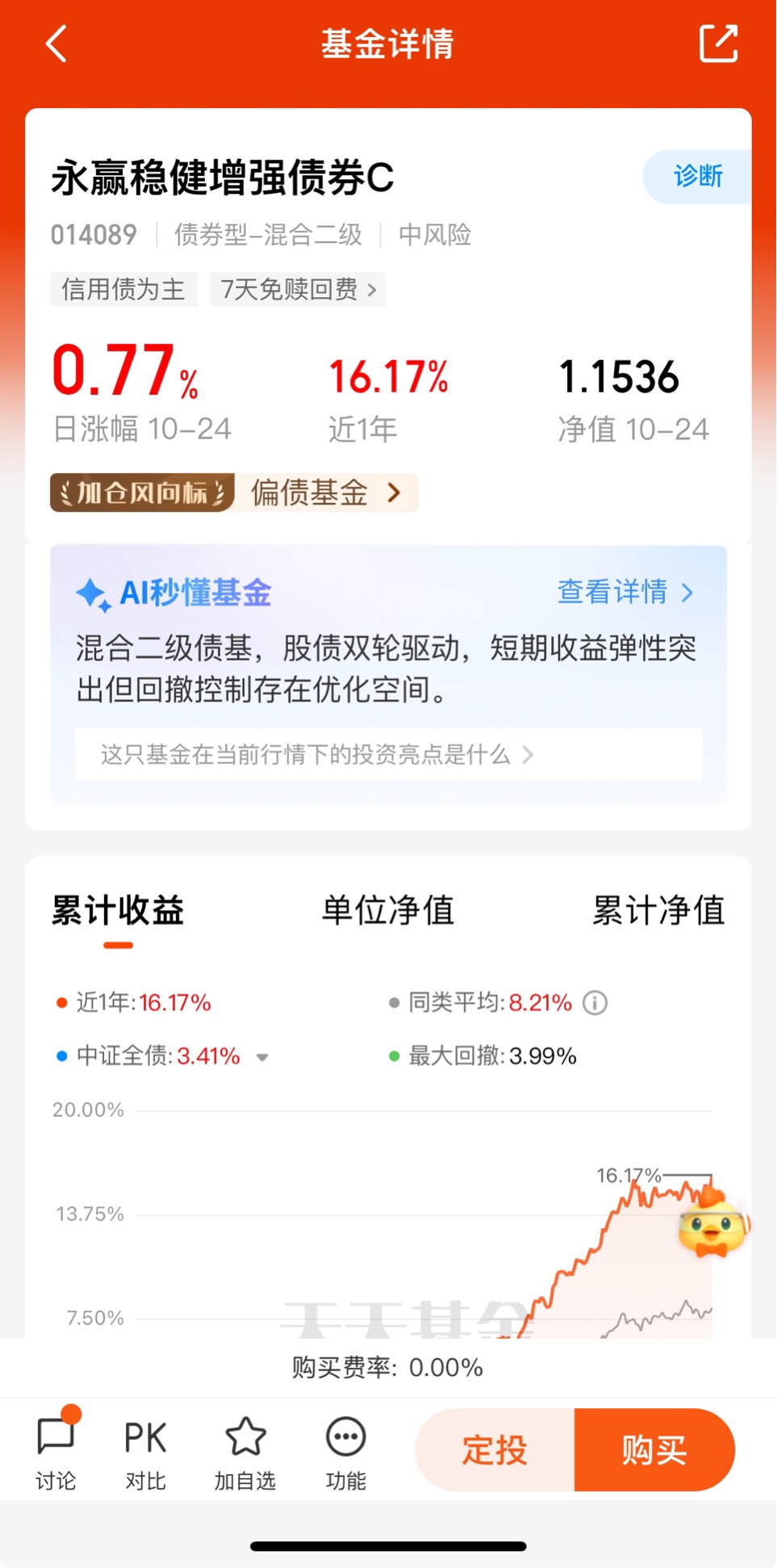 $永赢稳健增强债券C$ 上周五收77个蛋,近一周收144个蛋,近3个月收527个蛋,近6个月收1333个蛋,近一年收1617个蛋,表现优秀!它增强在严控风险的基础上持续辅以权益资产增厚收益,其采用债券稳健资产打底,再用权益资产增厚收益,相比其他混合债基其弹性更强!