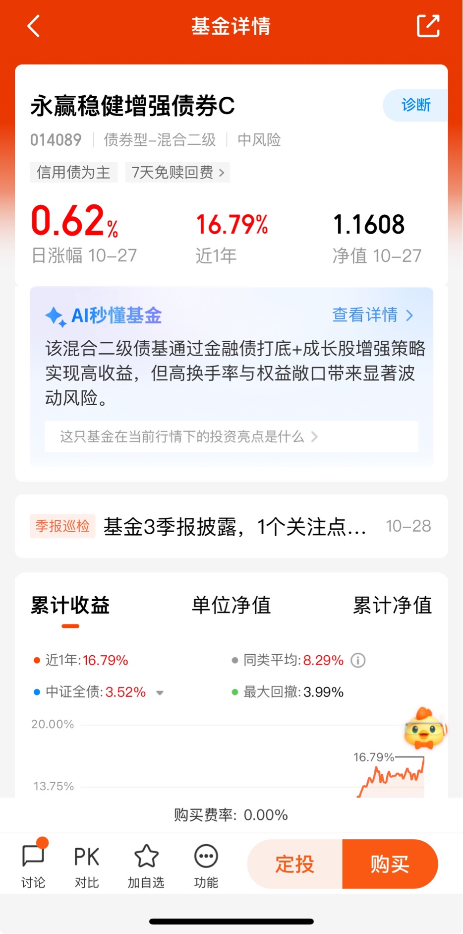 $永赢稳健增强债券C$ 昨天收62个蛋,近一周收175个蛋,近3个月收613个蛋,近6个月收1395个蛋,近一年收1679个蛋,各个阶段表现优秀!其核心在于采用了经典的“债券打底,权益增强”策略。组合的基石部分由高等级信用债构成,奠定了收益的稳定性,再灵活配置利率债以管理风险敞口!