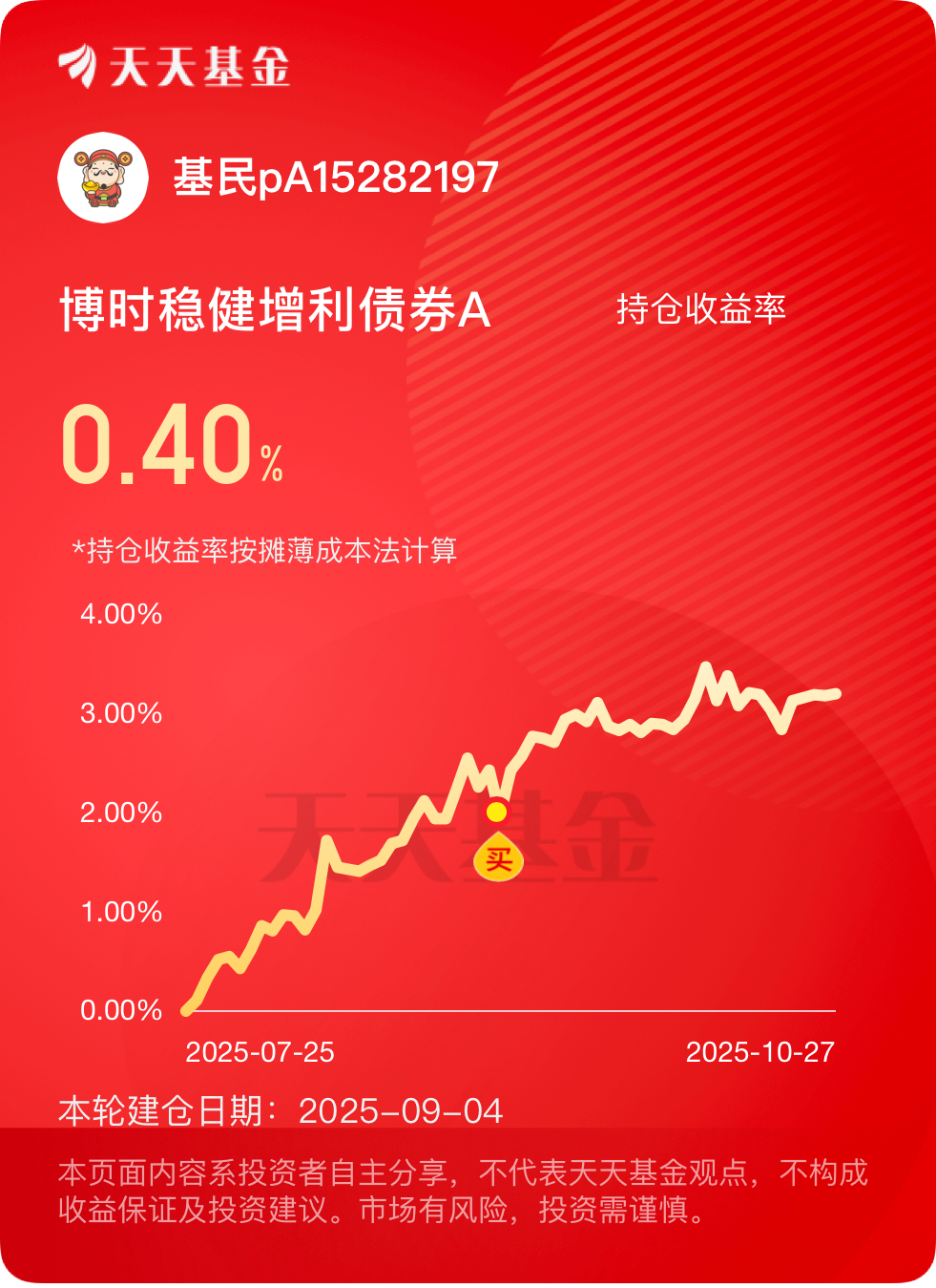 近期$博时稳健增利债券A$ 表现相当不错,昨天又稳稳添了新收益,近三月涨了3.2%,一年涨幅已经稳稳站在了9%以上,收益表现让人惊喜。最近央行要恢复公开市场国债买卖操作,10月27号金融街论坛年会上刚提的,这对债基来说简直是直接的利好。央行买入国债会直接增加市场对债券的需求,相当于给债市托了底,博时稳健增利这类以债券为主要配置的产品肯定最受益。而且专家分析说现在央行持有的国债占比已经降到去年8月的水平,重启购债的条件特别成熟,接下来债券收益率下行的概率很大,这只基金的收益空间肯定能打开。而且它权益仓的配置也很有讲究,权益部分虽然占比不高,但选的都是低估值的防御性板块,比如近期回调较多的消费和公用事业。近期中美经贸摩擦有不确定性,市场避险情绪升温,这类权益资产反而抗跌,还能给基金贡献点额外收益。基金经理更是精准踩中了近期的市场节奏,在权益市场回调的时候控制了仓位,而在债市修复行情里又重点发力债券端。这债券打底、权益增色的配置,在震荡市中也能持续收蛋。##A股盘中突破4000点!下个目标位在哪?#