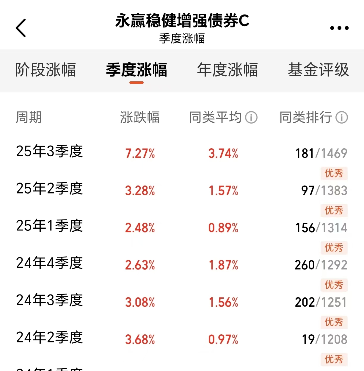 在复杂多变的市场环境中,投资者对投资的需求从以往偏重收益弹性,逐步转向对低波动与回撤控制的高度关注。$永赢稳健增强债券C$ (014089)堪称绩优“固收+”的代表,经常收大蛋,上个交易日收62个,已经连续6个季度正收益,展现出不俗的收益潜力!