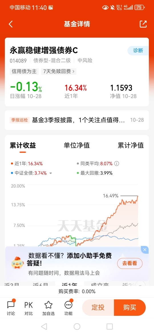 $永赢稳健增强债券C$ 持仓84.77%信用债奠定收益基础,同时配置19.88%股票仓位增强收益弹性,形成双轮驱动,前面一度六天五涨呐,近一年收1634枚大蛋,趁着最近回调我也买点看看了,妥妥滴收蛋神器,混债表现确实不错呀,继续期待#CPO、PCB大反攻!行情空间有多大?#