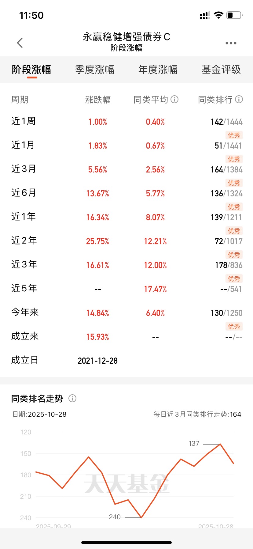 $永赢稳健增强债券C$ 是一只盈利率高而且回撤控制的又不错的固收加基金,主要以信用债为主,加上利率债做波段增加收益,还有少量的可转债和股票增厚收益,7天免赎回费也是这里的一个优势,省到就是赚到嘛!这里近三个月556个蛋,近一年1634个蛋,不得不说,固收加的抗波动能力还是很凸显的,值得期待了!#10月基金投资策略#
