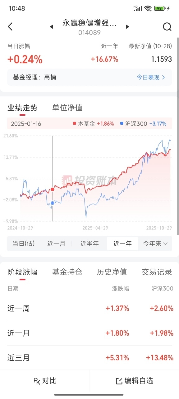 今天不错哦,股债大涨,开心数钱了,永赢稳健增强C014089今天估值给力有24个恐龙蛋,近三个月下蛋556个,近一年下蛋1634个,在固收+基金中表现非常优秀,业绩非常给力,存的私房钱上车了,等着继续上涨吃大蛋。