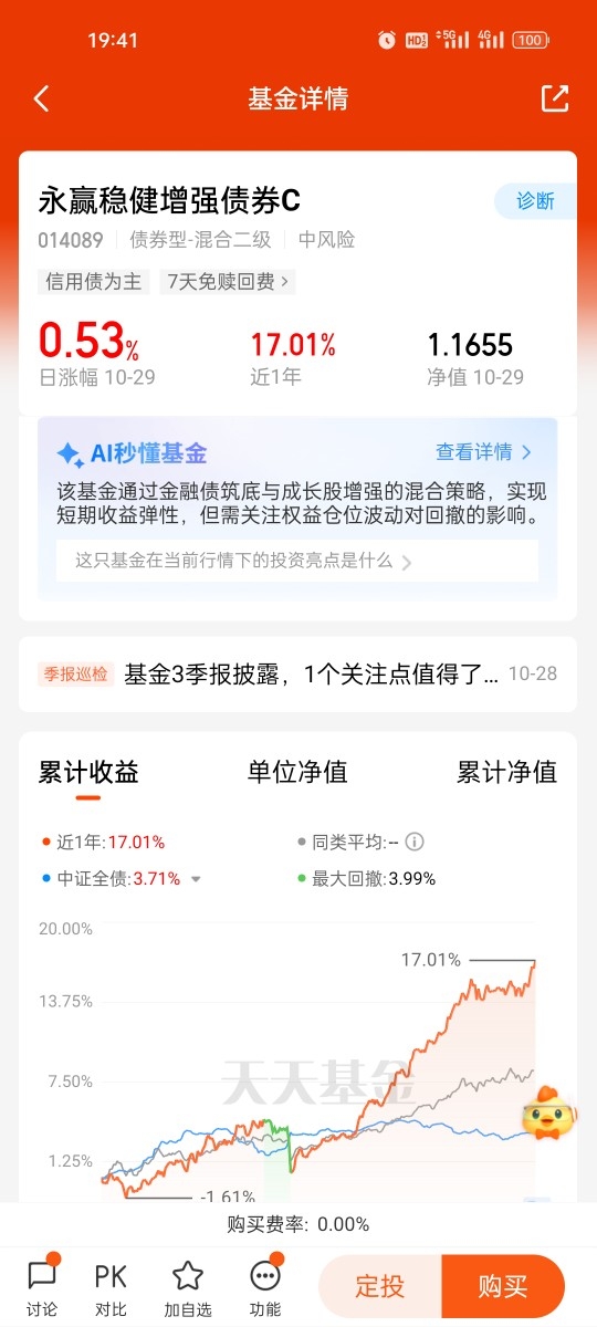 债券企稳回升最近连涨5天,表现真的很给力哈,永赢稳健增强C014089今天净值给