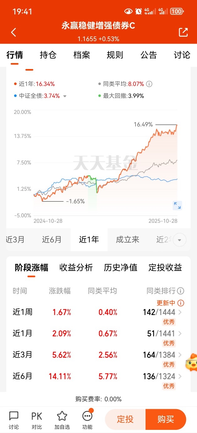 市场来回起伏,做好均衡配置还是有必要的。$永赢稳健增强债券C$ 今天收53个蛋,产品以高等级信用债为核心持仓,搭配利率债优化久期,构建稳健收益基础。我们来看看其它阶段业绩,近一周收167个蛋,近三个月收562个蛋,近六个月收1411个蛋,弹性不错。#黄金价格“高台跳水”:深蹲还是转向?#