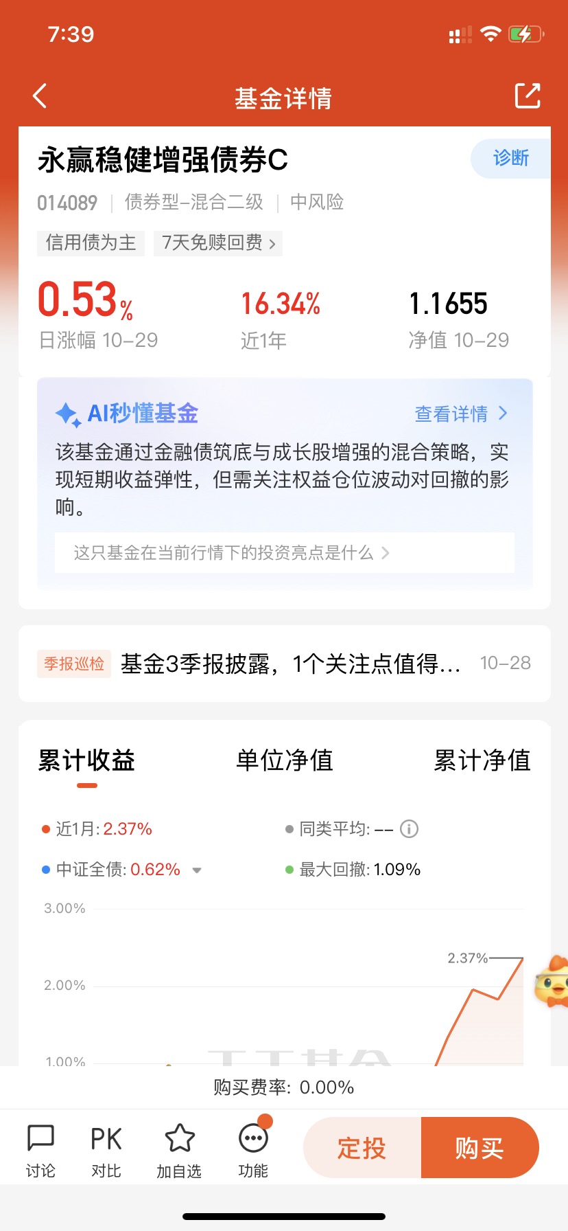 $永赢稳健增强债券C$ 今天收了53个蛋,四天三涨,近一周就收了100个蛋!这里是一只7天免赎回费固收加基金,主要以信用债为主,利率债为辅,还有少量的股票和可转债,如果你既不愿在市场风浪中剧烈颠簸,又不甘心微薄收益的,固收加是搭建组合配置的中间道路,降低风险又可以有不错的收益,值得期待了!#科技热点摊开业啦#
