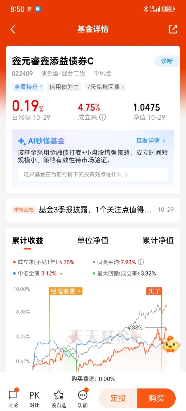 鑫元睿鑫添益债券股债搭配,攻守兼备,昨天收了19个蛋,成立以来收蛋475个。波动不大,挺省心