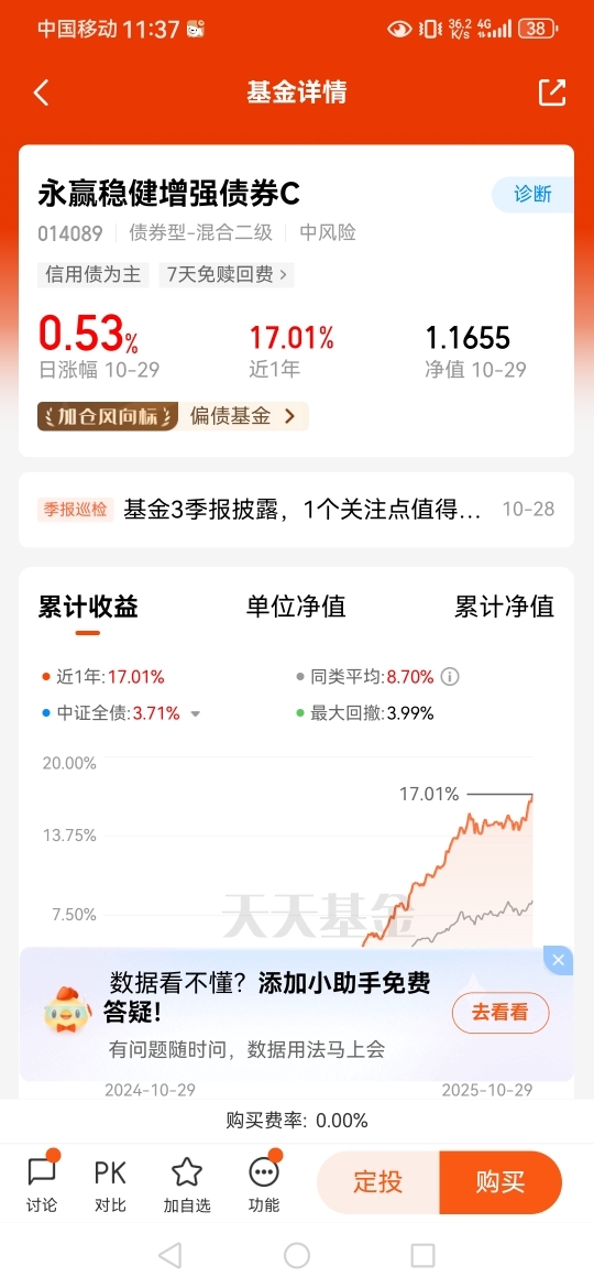 #A股突破4000点!下个目标位在哪?# 当前波动的市场行情之下,还是选择这种攻守兼备的产品会更好,$永赢稳健增强债券C$ 这款产品采用"债券打底+权益增强"的黄金配比,底层精选高等级信用债筑牢安全垫,搭配利率债优化久期管理,确保基础收益稳定;昨日产下53蛋,近一年涨幅+17.01%。