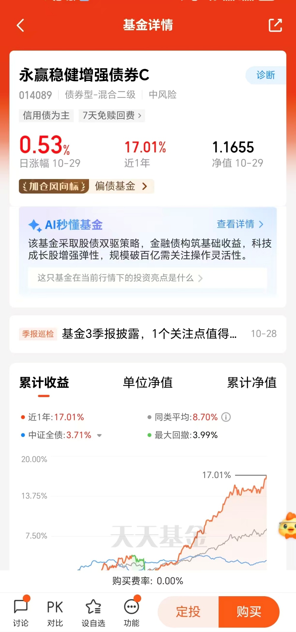 这款基金采用"债基打底+权益增强"的经典策略,底层债券以高等级信用债为主,搭配利率债优化久期,构建起稳固的收益基础。权益部分则精选低估值、高股息标的,并灵活配置可转债增强弹性,在市场波动中实现进退有据。业绩数据显示,该基金近1周收蛋167颗,近1月上涨2.09%,近三月上涨5.62%,近1年更是大涨17.01%,多阶段收益均跑赢同类产品。