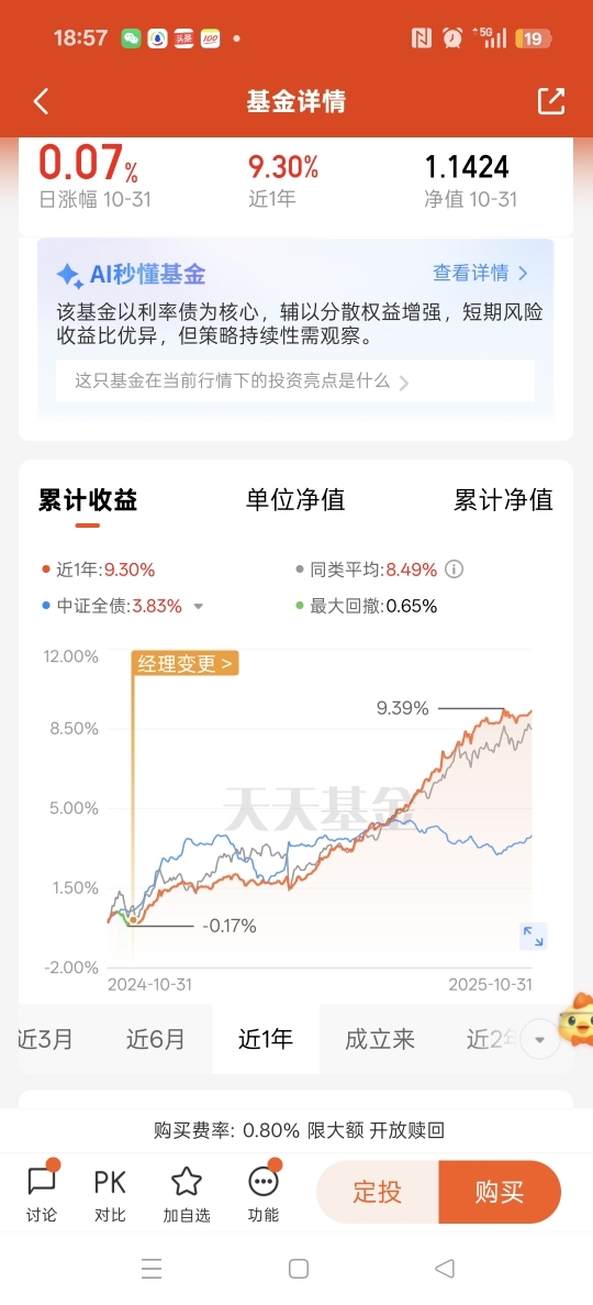 近期债市行情回升,$博时稳健增利债券A$ 上周连涨,表现相当亮眼,近一年涨幅超过9%,其持续赚钱能力也十分在线。债券部分一直是这只基金的强项,它持有不少中高等级信用债,票息收入非常稳定。近期财政部和央行专门开会说要配合国债买卖操作,现在前期买的国债陆续到期,央行很可能重启买入,这对债市可是直接的利好,博时稳健增利持有的国债和金融债肯定能从中受益。再看其权益仓方面,基金经理的布局也非常精准,他之前就提到会关注AI算力、半导体这些产业趋势,最近正好赶上科技板块的结构性行情,这部分持仓贡献了不少收益。科技板块作为当下的热门板块,发展前景广阔,这基基金能够提前布局,可见其选股精准。从历史表现来看,这只基金波动率控制得也不错,一年最大回撤才0.65%。在如今市场波动较大的情况下,这基展现了超强的稳定性和风险控制能力。在如今债市行情向好,权益市场也有机会的情况下,很期待其未来的收益!#11月基金投资策略#