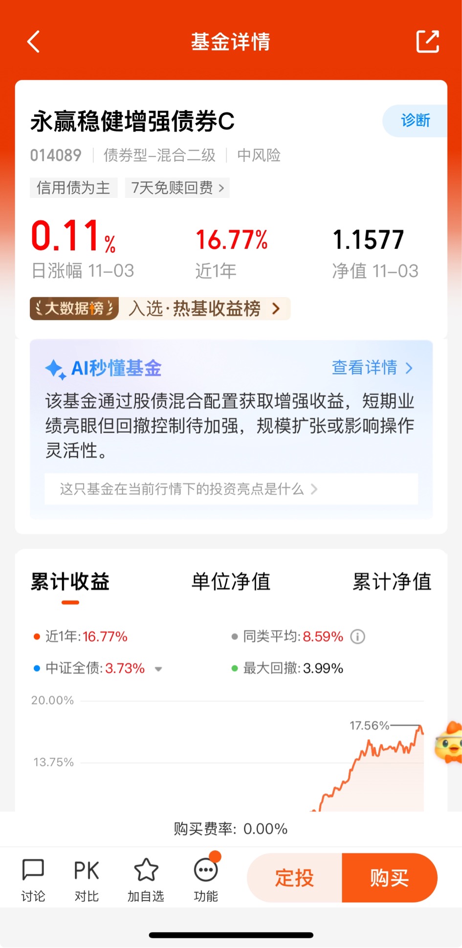 $永赢稳健增强债券C$ 昨天收11个蛋,近一个月收101个蛋,近3个月收522个蛋,近6个月收1319个蛋,近一年收 1677个蛋,表现优秀!通过“债基打底+权益增强”的双轮驱动策略,底层以高等级信用债构建安全垫,利率债辅助管理久期风险;权益部分择优布局低估值、高股息股票,并以可转债增厚收益,实现稳中求进!