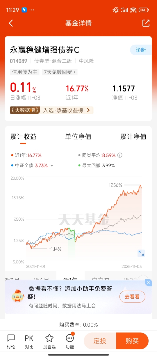 #11月基金投资策略# 稳健打底+权益增厚组合很适合目前波动市场,$永赢稳健增强债券C$ 昨晚11颗蛋。蛋大又多,近一月101颗蛋。近三月522颗蛋。近半年1319颗蛋,近一年达到1677颗蛋,各个阶段业绩表现优秀。基金通过股债混合配置,获取增强收益,又稳又能赚,值得信赖的固收债基!