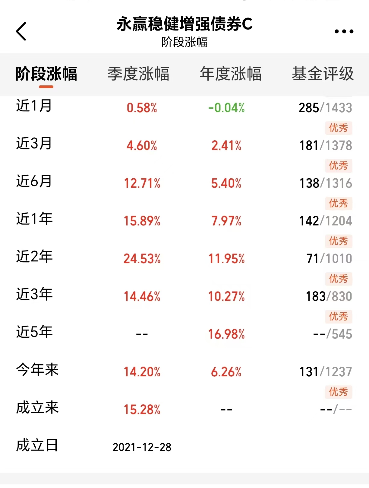从业绩数据来看,永赢稳健增强债券C(014089)的表现更是吸睛。近1个月收获了58颗蛋,相当于每个月都能有稳定的小收益进账;近3个月上涨4.60%,3个月的时间就能积累不少收益;近6个月上涨12.71%,半年时间收益直接突破两位数;近1年更是上涨15.89%,远超很多同类固收+产品;而且今年以来也取得了15.28%的收益,不管是短期持有想赚点零花钱,还是长期布局为资产增值,这款产品都能满足需求。