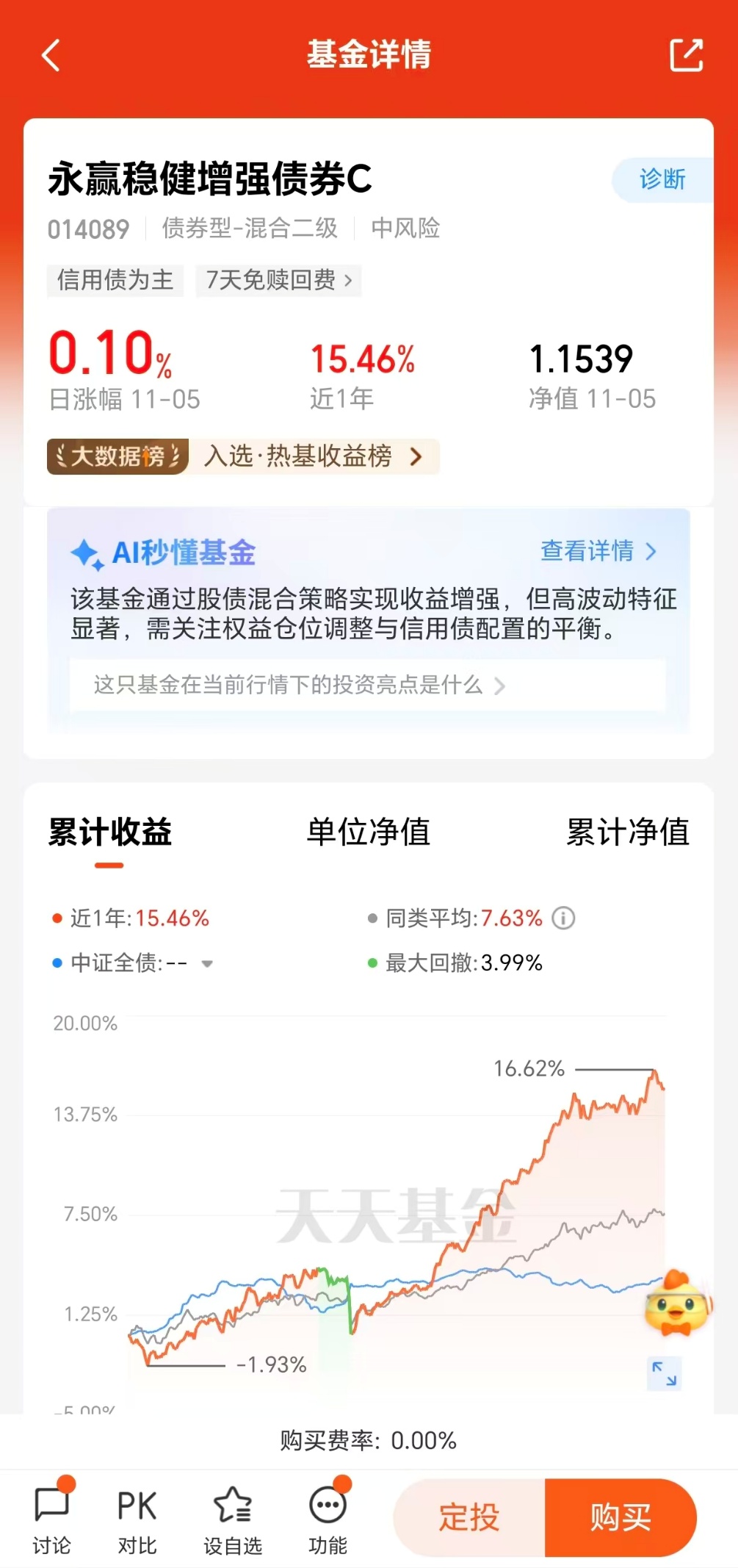 近期市场对稳健收益产品的需求明显上升,“固收+”策略成为投资者关注的焦点。在这样的背景下,$永赢稳健增强债券C$ (014089)凭借出色的业绩表现脱颖而出,不仅突出其作为绩优“固收+”产品的特性,昨日还收获了10颗大蛋,为投资者带来了稳健的投资回报。