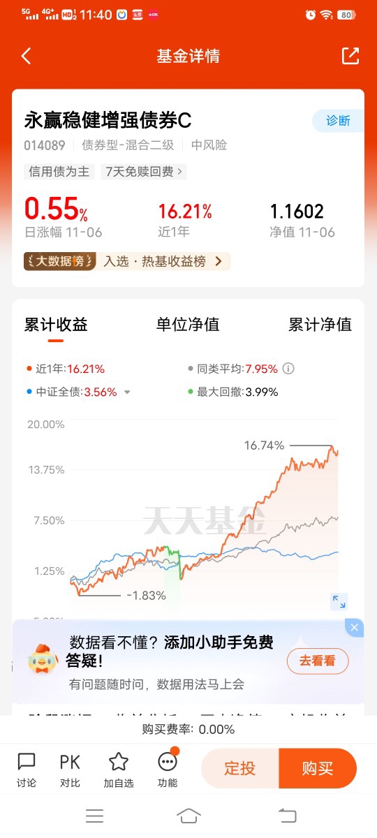 #4000点 到底要不要止盈?# 投资首先稳健,当然是债基表现好一些,其次是个股进攻性增厚业绩作为助攻点。$永赢稳健增强债券C$ 昨晚55颗蛋。近三月454颗蛋。近半年1299颗蛋。近一年1621颗蛋。各个阶段攒蛋业绩强劲啊。这款固收债基就是债劵打底,个股进攻增厚业绩的典范之一。进可攻退可守优选款!