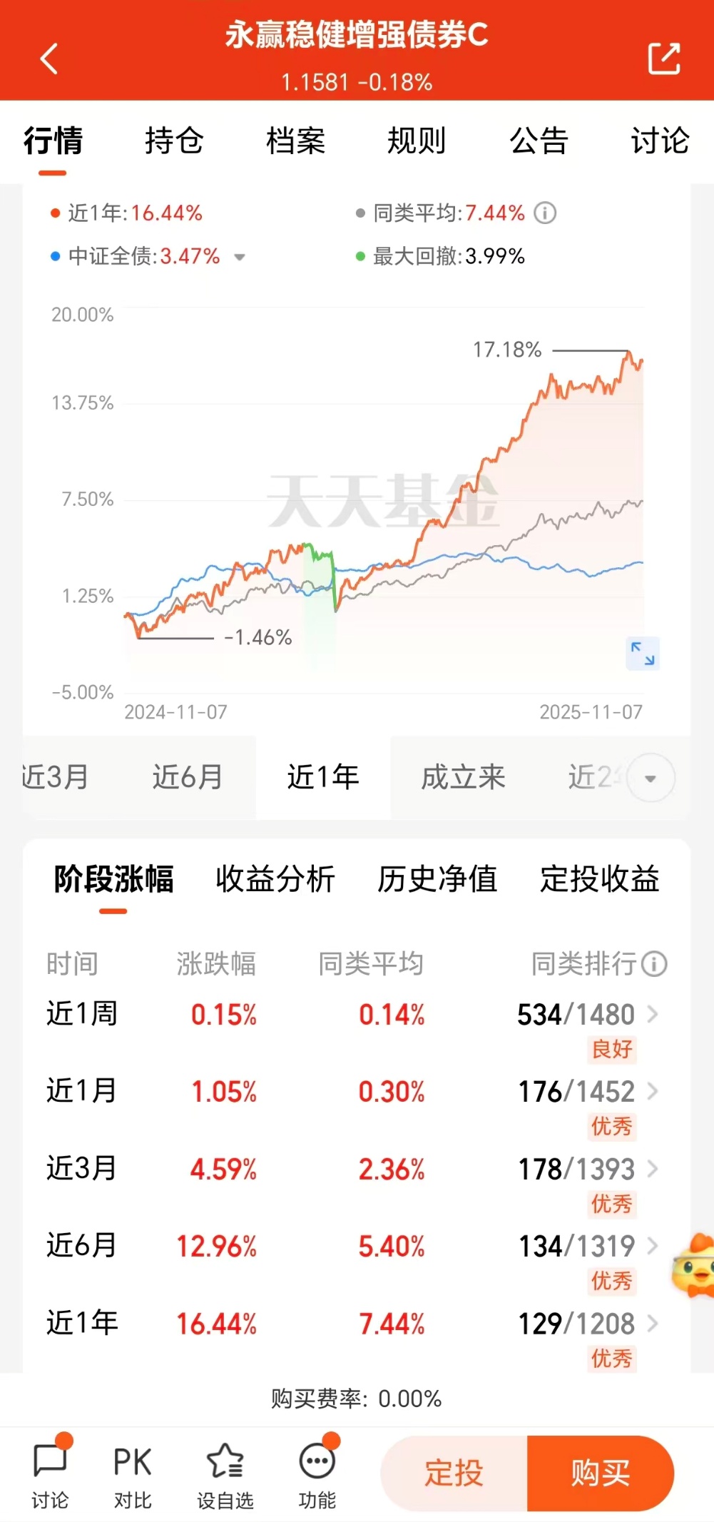 四季度市场开始回调了,越来越多投资者开始青睐“不折腾”的理财方式,固收+产品凭借攻守兼备的特性成为资金新宠。$永赢稳健增强债券C$ (014089)近期表现尤为抢眼,近1月收蛋105颗,近三月上涨4.59%,近6月上涨12.96%,近1年上涨16.44%,安心赚钱效果很明显。