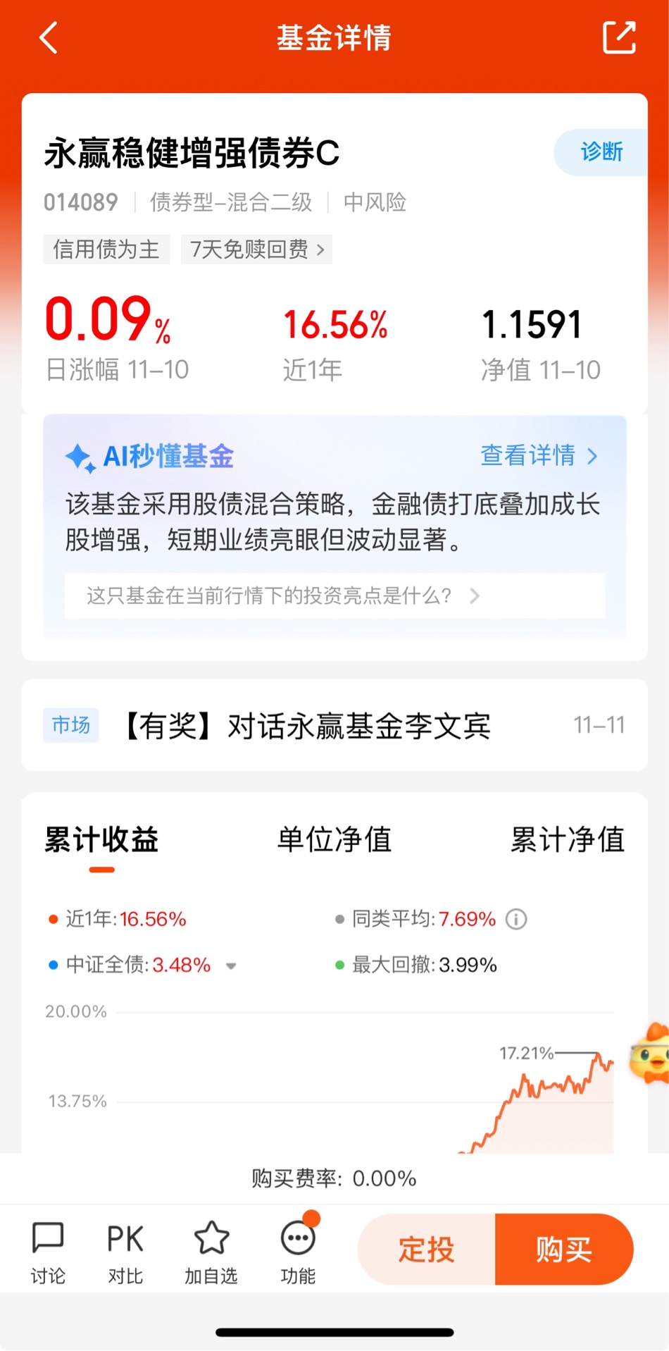 $永赢稳健增强债券C$ 昨天收9个蛋,近一个月收121个蛋,近3个月收454个蛋,近6个月收1309个蛋,近一年收1656个蛋,各个阶段表现优秀!是其“债基打底+权益增强”的组合策略:债券部分以高等级信用债为主,搭配利率债优化久期;权益部分精选低估值、高股息标的,辅以可转债增强弹性,形成了“进可攻、退可守”的投资闭环。