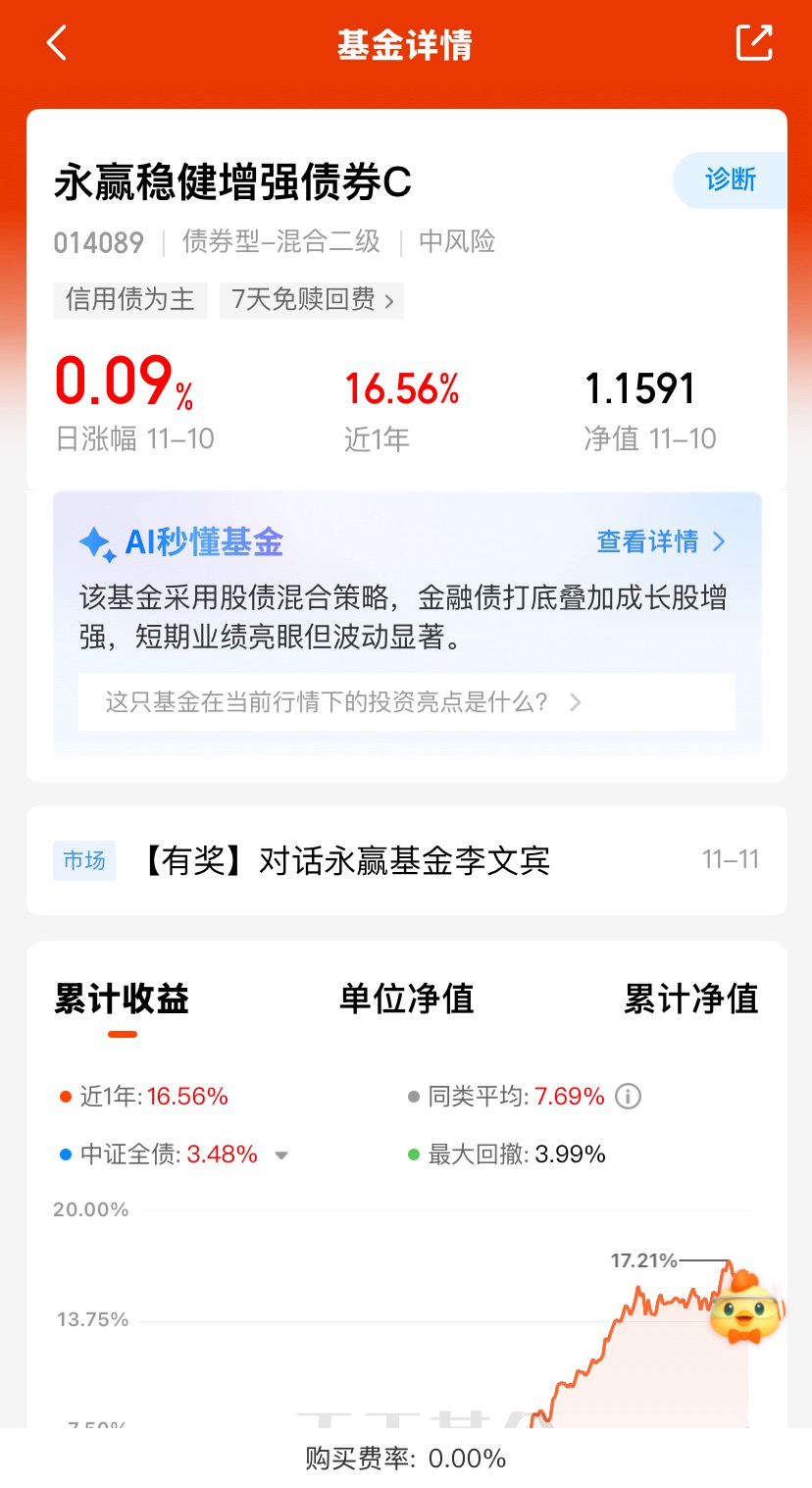 #4000点 到底要不要止盈?# 截至2025年第三季度,固收+产品整体规模创近三年新高,混合债券型二级基金规模提升较快。$永赢稳健增强债券C$ 昨天收9个蛋,近三个月收454个蛋,近六个月收1309个蛋,近一年收1656个蛋,各阶段的业绩优秀;投资者对含权中低波动型产品的接受度提高,稳健型和激进型固收+产品规模增长较快,未来市场对这类产品的需求将持续增加。