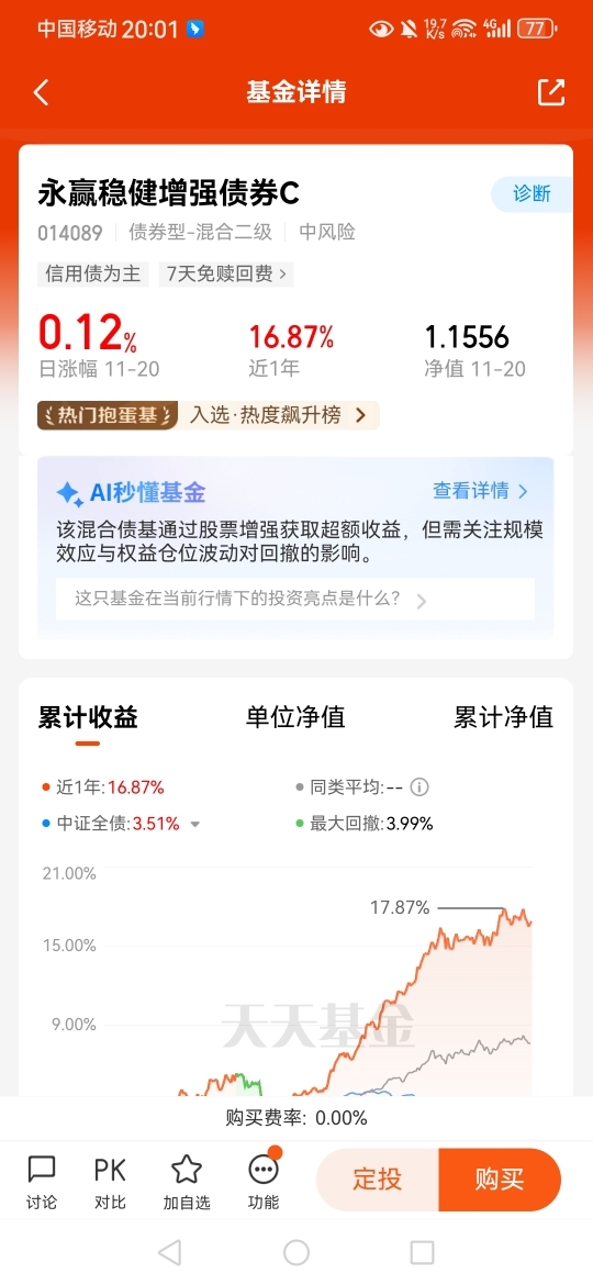 #4000点 该恐高?还是怕踏空?# 当前行情走势看"固收+"成了稳健理财的优选。永赢稳健增强债券C太强了,近一年涨幅+16.87%,用"债券筑底、权益添翼"的黄金策略: 底层以高等级信用债为核心持仓,搭配利率债灵活调整久期,稳稳筑牢收益底盘;权益部分则精挑低估值、高股息标的,再用可转债增厚弹性,让组合在市场波动中进退自如。
