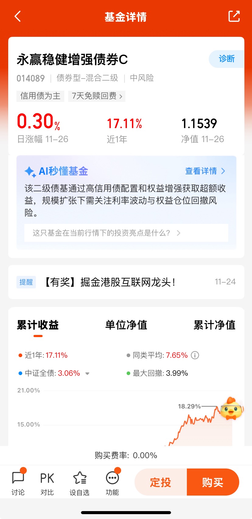 #观点搭子团火热招募中!# 通过“固收+”策略,大部分资产投资债券提供稳定收益,小部分配置股票、可转债等权益资产增强收益,进可攻退可守;$永赢稳健增强债券C$ 昨天收30个大蛋,近三个月收134个蛋,近六个月收1229个蛋,近一年收1711个蛋,各阶段的业绩优秀;固收类产品的收益相对稳定,能够为投资者提供较为可靠的收益。即使在市场波动较大时,其收益也不会出现大幅波动。更适合稳健的投资者。