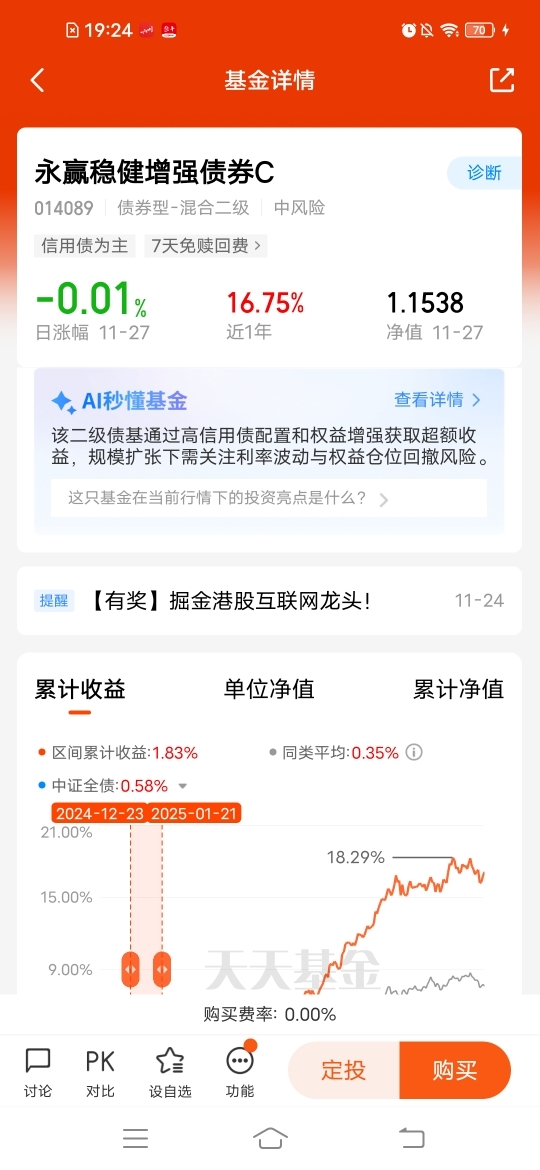 $永赢稳健增强债券C$ 还是这里稳妥点,中长期攒蛋更有性价比,近三个月收169个蛋,近半年收1212个蛋,近一年收1675个蛋,永赢稳健增强在严控风险的基础上持续辅以权益资产增厚收益,相比同类超额收益明显,其采用债券稳健资产打底,再用权益资产增厚收益,相比其他混合债基其弹性更强。趁着债市波动,跟上。#银行股逆势走强!行情逻辑是什么?#