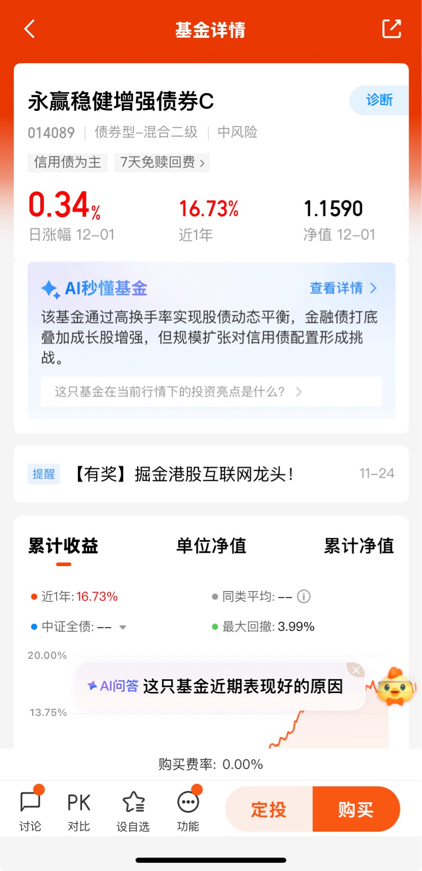 #今年你的投资目标达成了吗?# 混债基金的资产配置较为分散,既投资于债券市场,又投资于股票市场或可转债市场。在不同市场环境和经济周期下,债券和股票的表现往往具有一定的互补性,通过分散投资可以降低单一资产的风险,提高投资组合的稳定性。$永赢稳健增强债券C$ 今天收34个大蛋,近一年收1673个蛋,各阶段的业绩优秀;长期来看,混债基金(如二级债基指数)过去10年累计涨幅显著高于沪深300指数,波动率更低,显示其“进可攻、退可守”的特性。