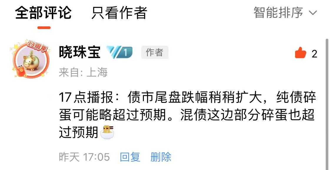 注意,如果播报后,债市尾盘拉升或者跳水,17点左右我会在估值帖子的评论区更新情况。