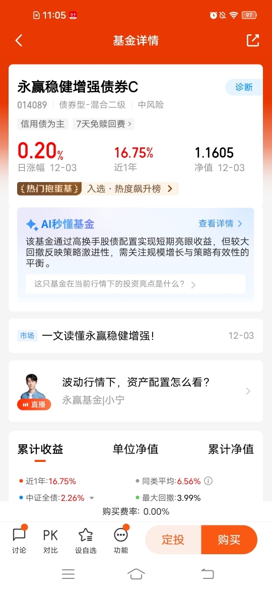 $永赢稳健增强债券C$ 这只近一年收益超16%的热门固收加全市场排名靠前,昨天收20个蛋,近三个月收119个蛋,近半年收1226个蛋,近一年收1675个蛋,收蛋能力不错,中长期更有优势,只配置权益风险大,近期行情震荡,增加固收+配置,债券打底,让你的收益稳一点,较高仓位债券打底,再配置一定股票来增强收益,攻守兼备。#12月基金投资策略#