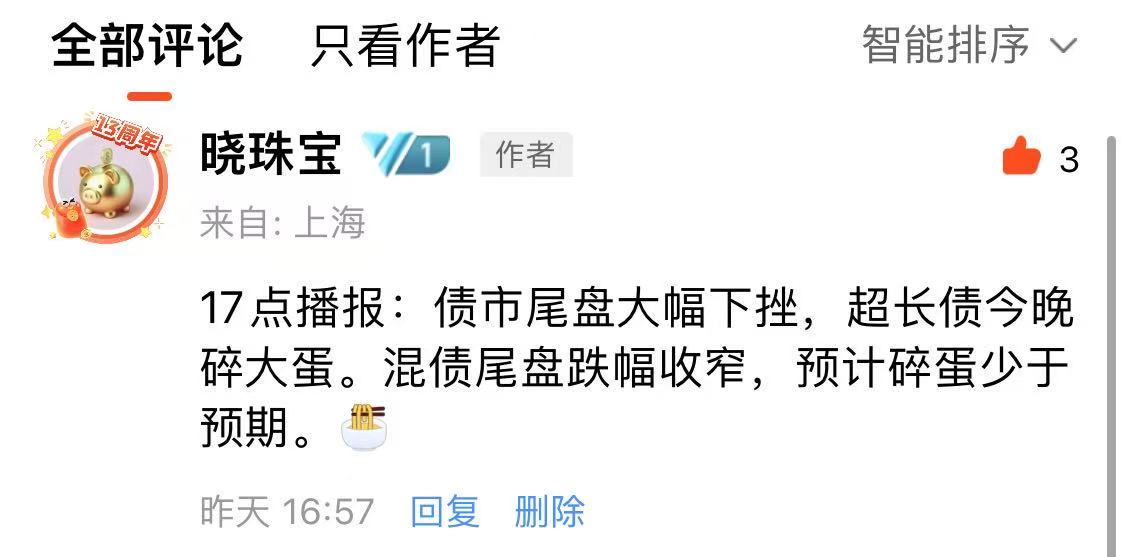 注意,如果播报后,债市尾盘拉升或者跳水,17点左右我会在估值帖子的评论区更新情况。