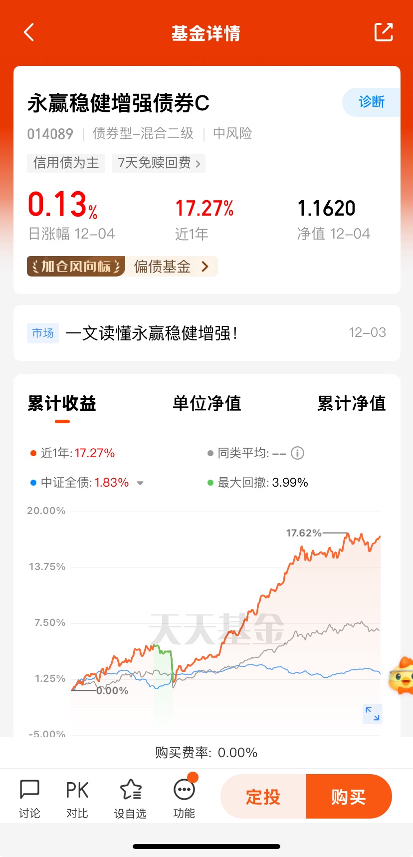 #2025年A股沪指收盘点位大猜想# 固收类产品通过股债动态配置,在权益市场波动时仍能保持相对稳定的净值,最大回撤控制较好,持有体验优于纯债基金,受到更多关注;$永赢稳健增强债券C$ 今天收13个蛋,近三个月收240个蛋,近六个月收1164个蛋,近一年收1727个蛋,各阶段的业绩优秀;固收类产品的收益相对稳定,能够为投资者提供较为可靠的收益。即使在市场波动较大时,其收益也不会出现大幅波动。