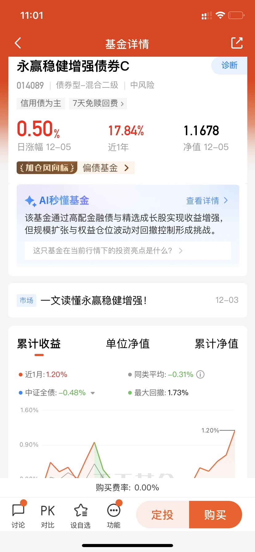 $永赢稳健增强债券C$ 上周五收了50个蛋,上周五天四涨,近期十天八涨,不得不说,这里的回撤控制的是真不错,抗波动又能涨的一个啊!近三个月213个蛋,近半年1178个蛋,近一年1784个蛋,业绩表现优秀亮眼的很,这里是持满7天免赎回费的固收加基金,主要以信用债为主,期待接下来的更好的表现了!#12月基金投资策略#