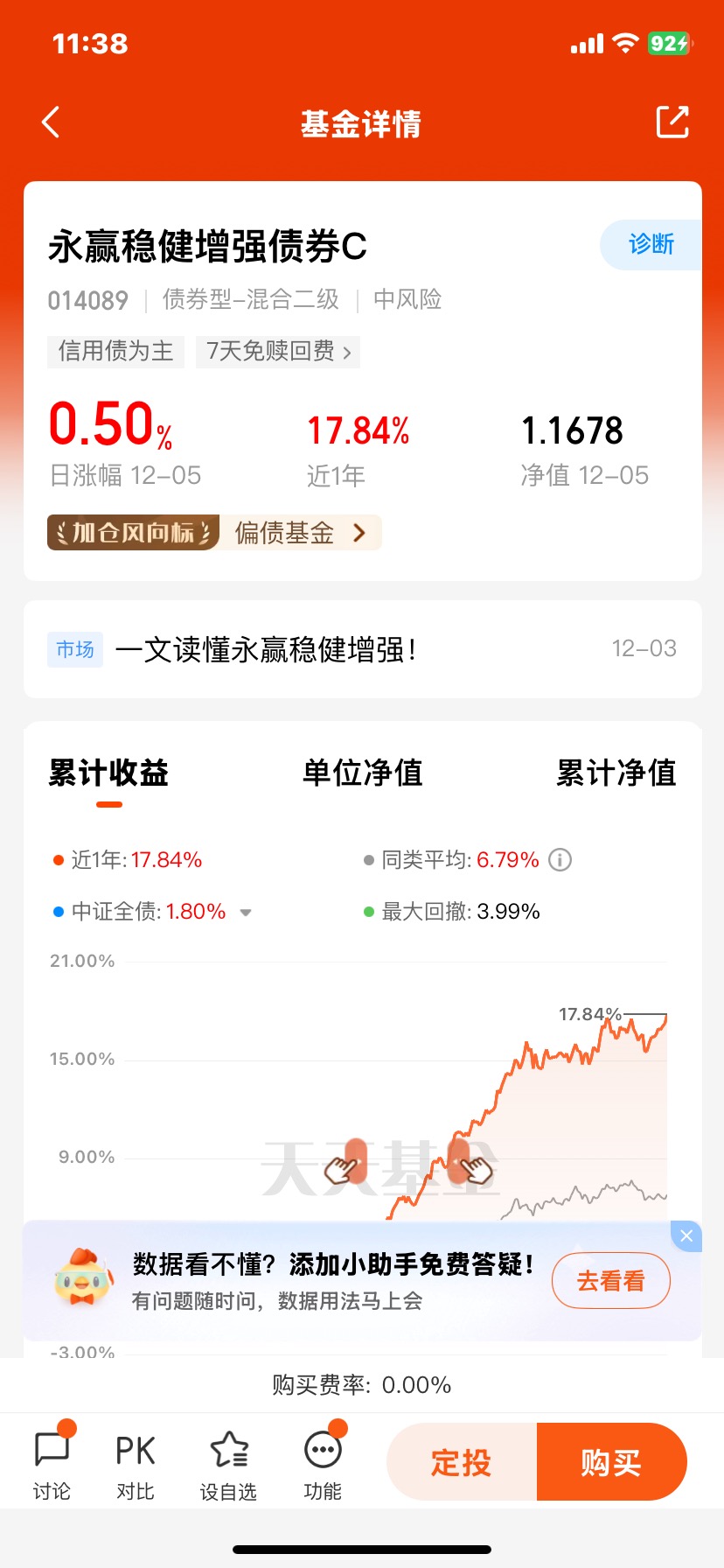 #12月你看好哪条投资主线?# 债市受资金面、政策预期等因素影响呈震荡态势,权益市场活跃度提升,部分固收产品通过股债搭配实现了较好的收益,$永赢稳健增强债券C$ 上一个交易日收50个大蛋,近三个月收213个蛋,近六个月收1178个蛋,近一年收1784个蛋,各阶段的业绩优秀;固收类产品通过股债动态配置,在权益市场波动时仍能保持相对稳定的净值,最大回撤控制较好,持有体验优于纯债基金,受到更多关注。