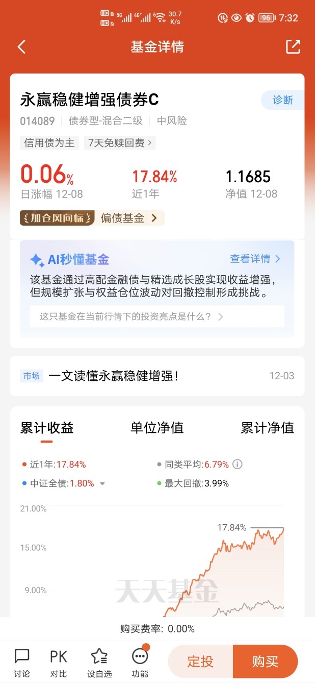 在市场复苏进程中,目前债券市场保持稳定,权益市场中的低估值板块出现回暖,这为固收+产品提供了双重机会。$永赢稳健增强债券C$ 今晚收下6颗蛋,已经连续上涨4天了,凭借着债基打底+权益增强的黄金组合,底层债券持仓以高等级信用债为核心,搭配利率债优化久期,形成可靠的收益基础。权益部分精选低估值、高股息标的,辅以可转债增强弹性,使其在市场起伏中能够稳健前行#12月基金投资策略#