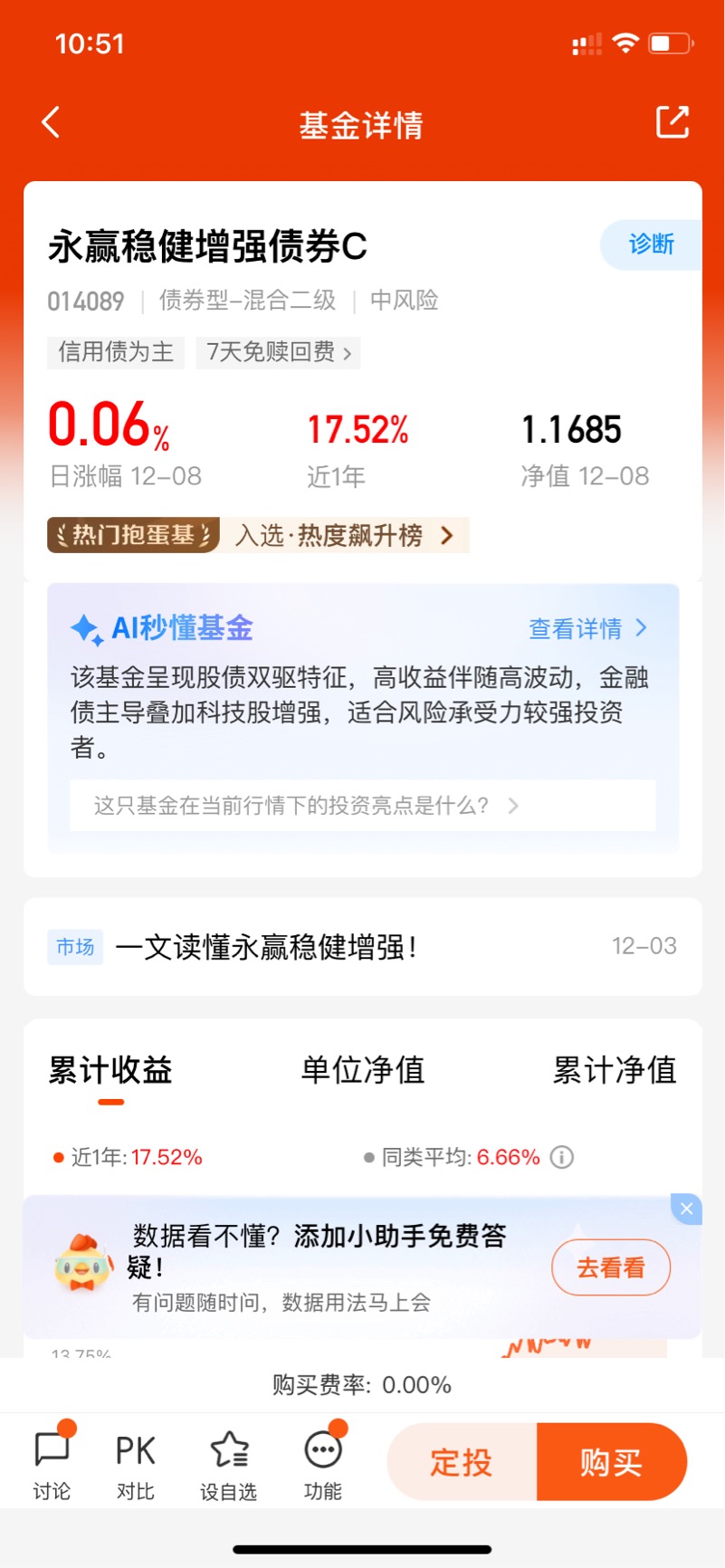 最近市场震荡,固收加基表现倒是很抗波动!$永赢稳健增强债券C$ 昨天收了6个蛋,四连涨了,一共收了89个蛋,平均每天22个蛋还多,真是个给力的!这里就是典型的股债混合偏债的基金,主要以信用债和利率债固收打底,加上少量的可转债和股票来增厚收益,这样的配置策略在市场上还是很受大家欢迎的咯!#12月基金投资策略#