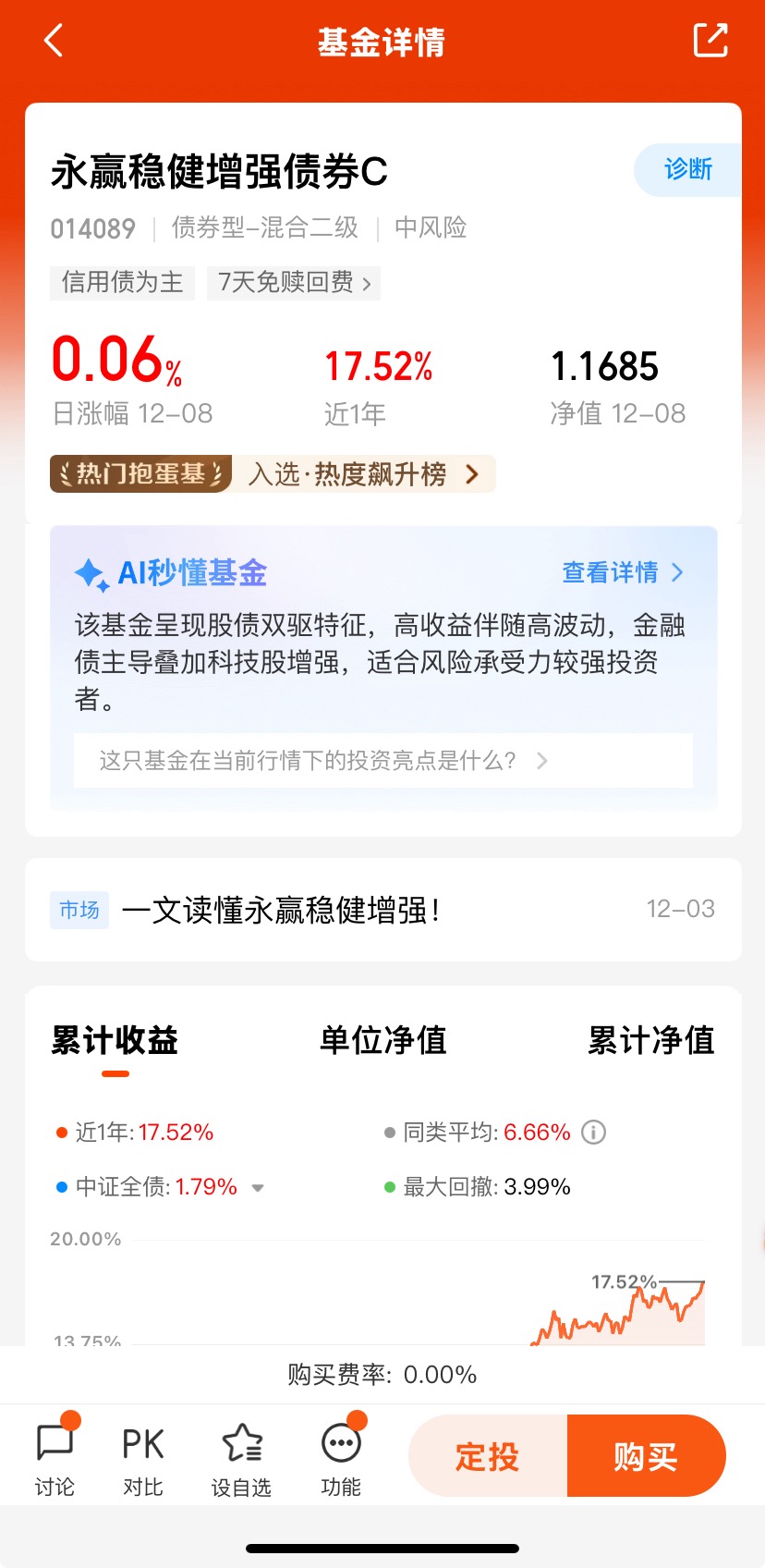 #券商行业迎利好:杠杆上限“松绑”# 混合债基通过股债动态配置,在权益市场波动时仍能保持相对稳定的净值,最大回撤控制较好,持有体验优于纯债基金,受到更多关注;$永赢稳健增强债券C$ 昨天收6个蛋,最近连涨4天收89个蛋优秀!近三个月收285个蛋,近六个月收1204个蛋,近一年收1752个蛋,长期业绩优秀;随着利率下行空间有限,纯债资本利得空间收窄,投资者对收益增强型产品的需求可能增加,混债作为“固收+”的典型代表,有望吸引更多资金流入。