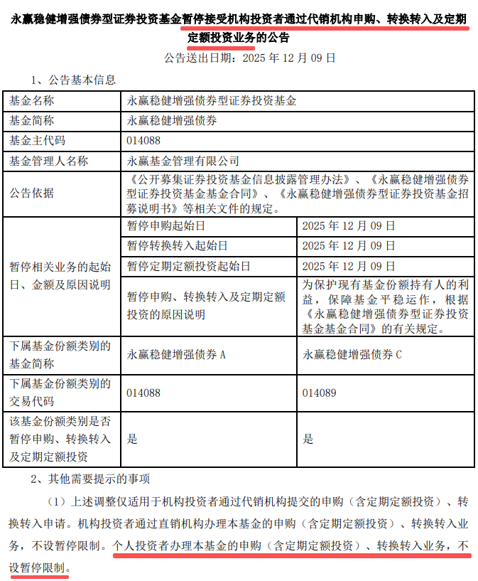 12月9日,永赢基金发布一则关于旗下永赢稳健增强债券(014088)的限购公告:
