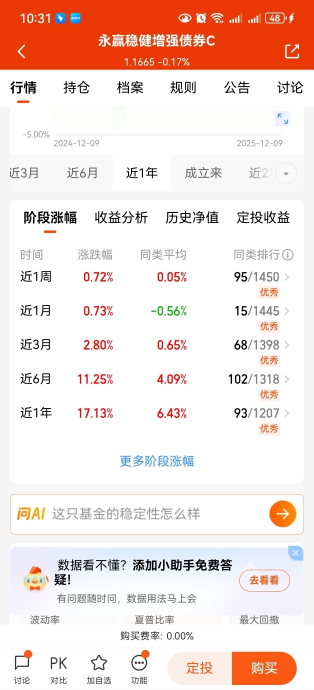 年底震荡行情,选一只优质固收加做均衡配置还是有必要的。$永赢稳健增强债券C$近六