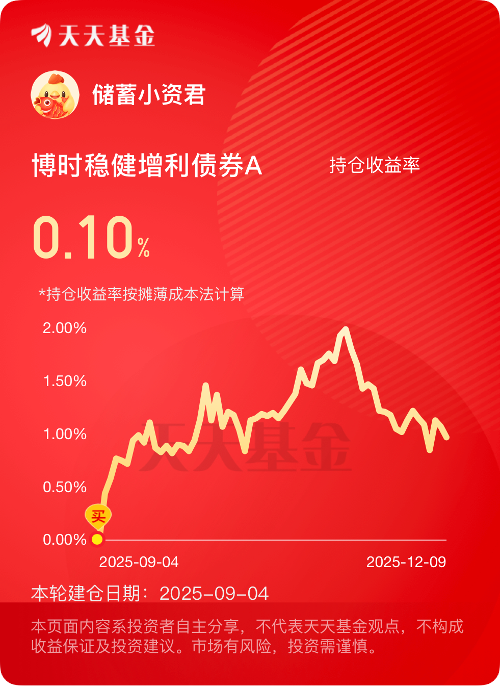 :经验告诉我,震荡市里“债券求稳,股票添收益”这个策略很管用。$博时稳健增利债券A$ 近一年有7.86%的收益,最大回撤却仅有1.11%,就是很好的证明。12月10日财政部发行600亿元91天期贴现国债,对这基来说简直是“政策红包”!贴现国债是无票面利率、按折扣价发行的短期国债,安全性极高,而且这次发行规模600亿,还允许甲类成员追加投标,能有效调节市场短期资金供求,进一步稳固债市流动性。这只基金债券占比80%以上,以高评级信用债和利率债为主,财政部加大短期国债供给,相当于给债券持仓加了层安全垫。更惊喜的是它的权益仓,20%左右的股票仓位精准布局了制造业龙头,正好契合当前股市的结构性机会!重仓的宏创控股属于有色金属加工制造领域,近期随着工业需求回暖,这类制造业龙头估值处于低位,后续修复空间很大。还有华友钴业,作为新能源产业链的核心标的,受益于绿色能源政策推进,长期成长逻辑清晰。现在债市有600亿贴现国债托底流动性,股市3800点有结构性机会,加上平台还有20元优惠券可以领,上车成本更低,这波真的很难拒绝了!#摩尔线程市值超3300亿!估值逻辑是什么?#