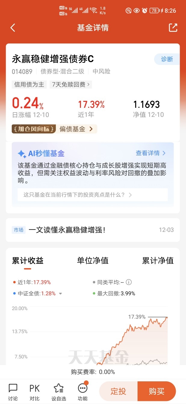 经验告诉我,震荡市里债券求稳,权益增强这个策略很管用。$永赢稳健增强债券C$今天