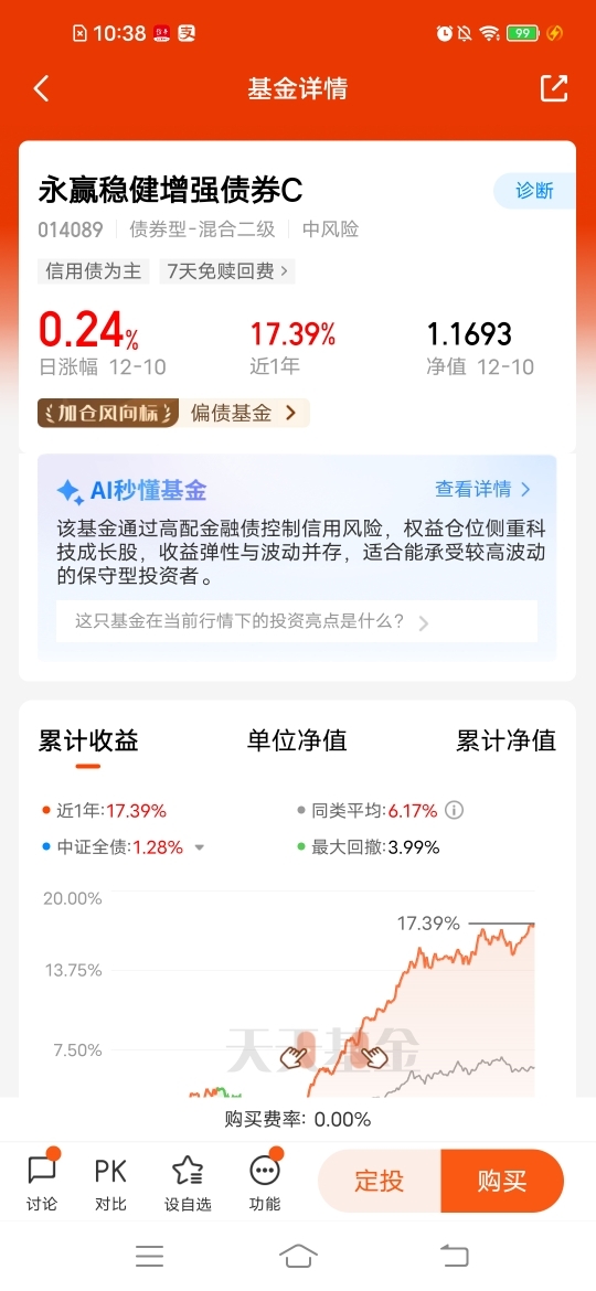$永赢稳健增强债券C$ 固收加稳妥点,稳健布局也不错,能涨抗跌的,昨天收24个蛋,近一个月收88个蛋,近半年收1125个蛋,近一年收1739个蛋,收蛋能力不错,拿久一点更有动力,只配置权益风险大,当下均衡配置更适宜。较高仓位债券打底,再配置一定股票来增强收益,进退皆宜,也比较适合震荡市场。#12月基金投资策略#
