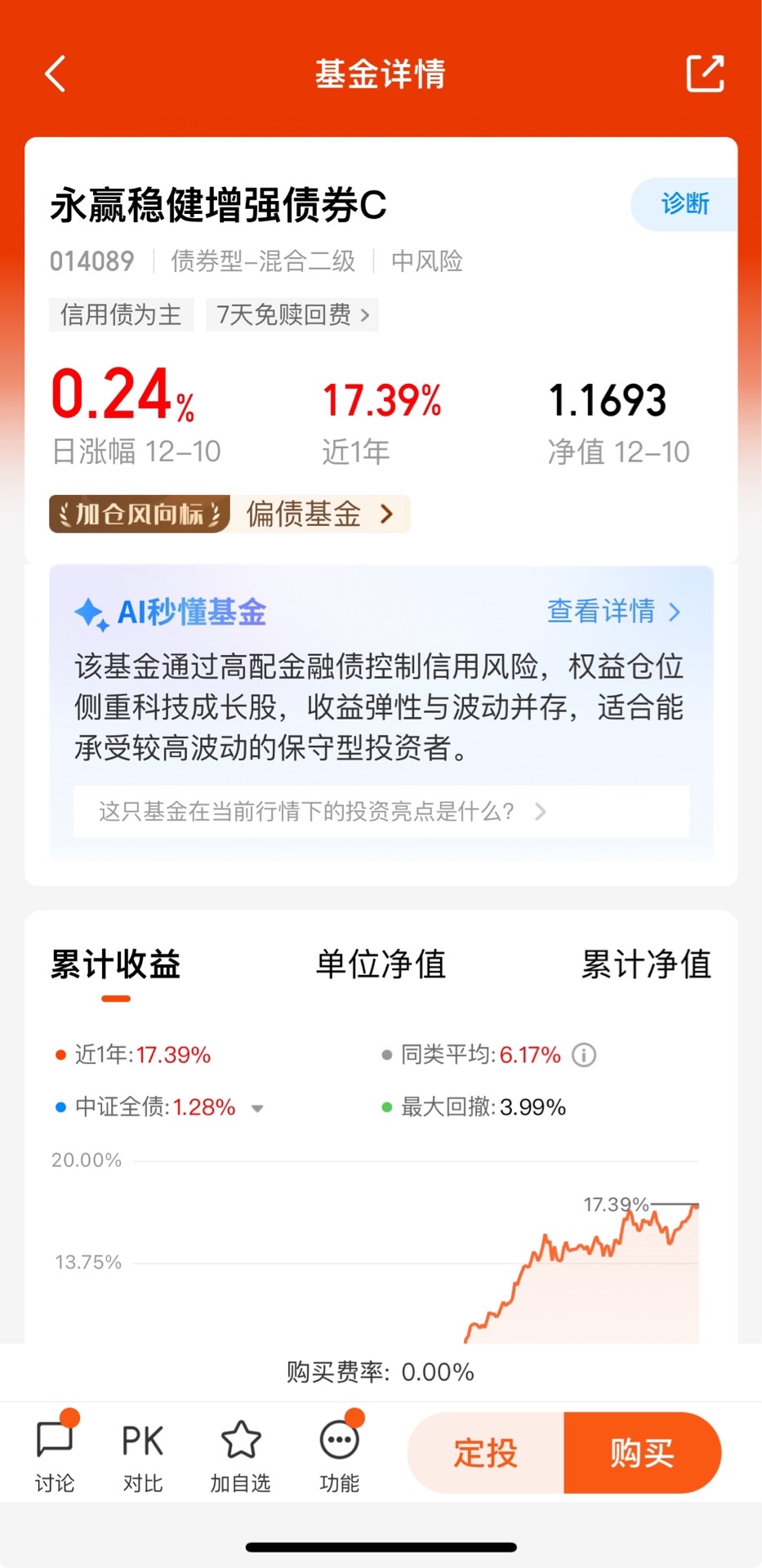 $永赢稳健增强债券C$ 昨天收24个蛋,近一个月收88个蛋,近3个月收303个蛋,近6个月收1125个蛋,近一年收1739个蛋,各个阶段表现优秀!这种股债两市的结构性机会,恰好是优秀固收+产品能够灵活捕捉的。这直接推动了固收+的关注度,持续跟进。这里就是典型的股债混合偏债的基金,主要以信用债和利率债固收打底,加上少量的可转债和股票来增厚收益,不错不错!