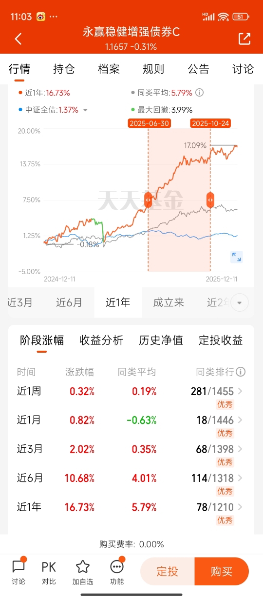 #美联储宣布降息25个基点 如何布局?# 选对固收债基,实现稳健增益。趁跌补补$永赢稳健增强债券C$ ,近一月82颗蛋,近半年收1068颗蛋。近一年涨幅达到16.73%。各个阶段均有大涨幅,单日数量超过10个蛋的天数就达到了100多天。作为固收债基收益非常的可观,回撤把控优秀。近期行情震荡。债券打底个股进攻,很好的平滑风险,让收益稳一点!