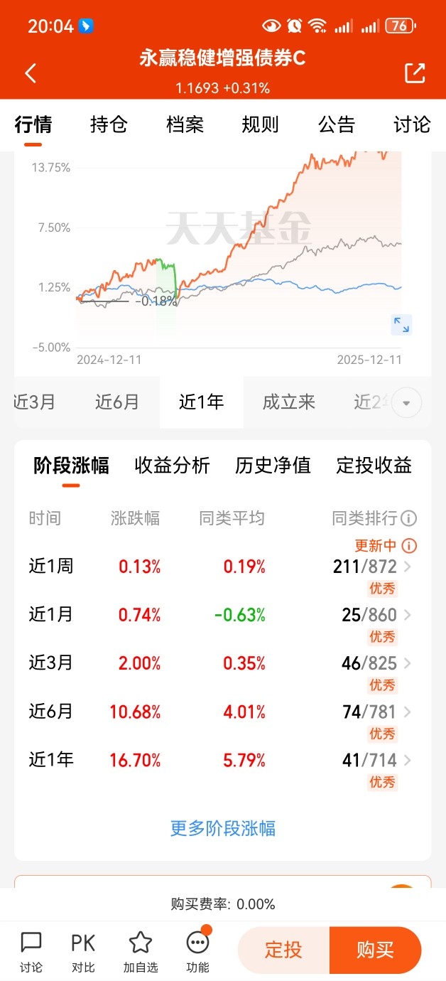 红红火火的周五,$永赢稳健增强债券C$ 今天收31个大蛋,产品以债基打底+权益增强为核心策略的黄金组合,凭借攻守兼备特性成为资产配置优选,放长眼光来看业绩也不错,近六个月收1068个大蛋,近一年收1670个大蛋,弹性还不错,均衡配置我看行。#美联储宣布降息25个基点 如何布局?#