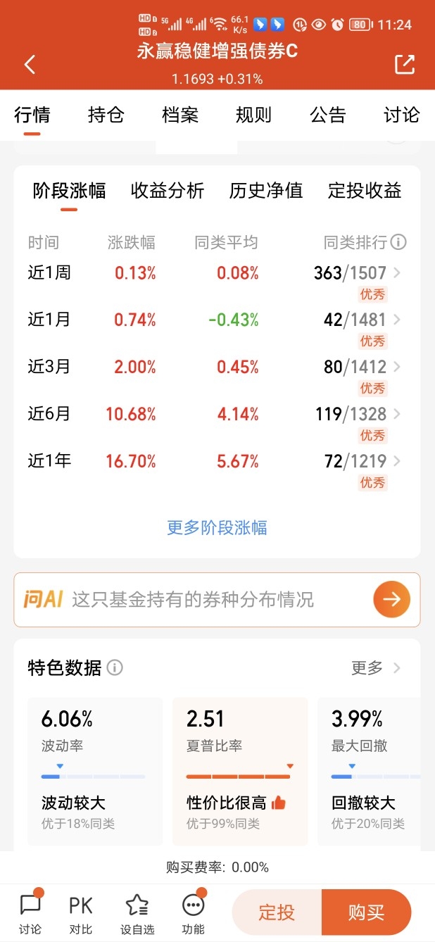 各个阶段排名都很优秀的$永赢稳健增强债券C$采用债基打底+权益增的黄金组合,债券