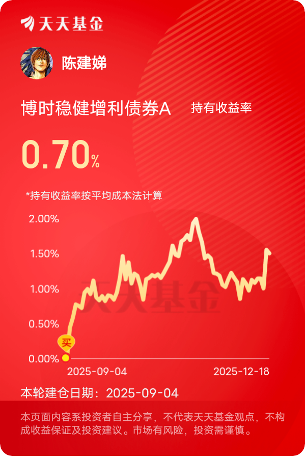 市场波动时,就得把风险拴牢,$博时稳健增利债券A$ 的策略我挺认可,债券资产作为基石,同时用一小部分灵活把握股市机会。回撤小,一年下来拿下将近8%的收益,挺满意的。12月16日财政部专门针对25附息国债15、17开展做市支持,成交总量超7.7亿元,中标收益率低至1.4%。这只基金的债券仓位里,高等级利率债占比近60%,财政部主动下场做市,相当于给这些国债的流动性和价格稳定性上了“双保险”,票息收益有保障,还能赚得资本利得。再加上中央经济工作会议明确“灵活高效降准降息”,10年期国债收益率近期下触1.8%的低位,债券部分的收益底座打得特别牢。近期国内火箭发射进入密集期,SpaceX星舰技术持续突破,商业航天产业链迎来爆发窗口。这只基金的权益仓位准踩中了商业航天这个大热点,持仓的航天工程、长城电工等标的,要么是长征火箭发射服务核心供应商,要么兼具核电+商业航天双重逻辑,12月以来股价涨幅都超12%。现在A股在3800点震荡,正是布局这类高景气赛道的好时机,再偷偷说个薅羊毛小技巧,搜索“博时固收”就有20元券,相当于买入就赚一笔补贴。#长征十二甲要来了!商业航天如何掘金?# #晒收益#
