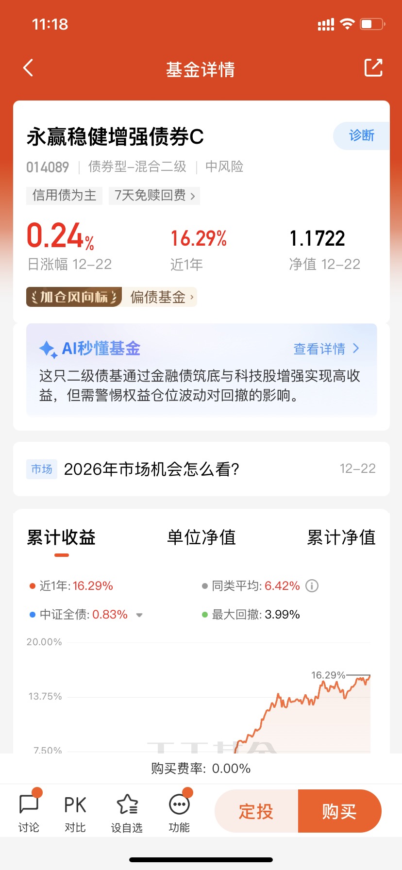 $永赢稳健增强债券C$ 昨天收了24个大蛋,两天收了50个蛋回来!不得不说,这里的收蛋能力确实强,近一个月就收了238个蛋,近半年收了1140个蛋,近一年1629个蛋,各个阶段的业绩表现均远超同类平均表现,优秀的很了!这里主要是信用债和利率债稳健底仓,加上权益来增厚收益,可以说进可攻退可守,确实值得关注了!#马斯克点赞!宇树机器人跳舞出圈 #