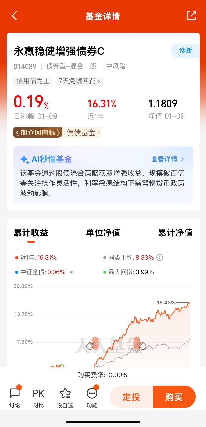 #暖阳创作计划# 在货币政策保持宽松、经济温和修复的背景下,债市仍具配置价值,但利率中枢可能维持低位。“固收+”产品将通过灵活配置权益资产,捕捉市场红利。$永赢稳健增强债券C$ 上周五收19个蛋,近一个月收123个蛋,近三个月收271个蛋,近六个月收939个蛋,近一年收1631个蛋,长期业绩优秀;固收类产品通常在投资前明确预期收益率,能为投资者提供相对稳定的现金流,适合追求稳健收益的投资者。
